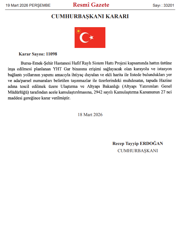 Söz konusu karar, Bursa’da yapımı süren ulaşım projelerinin hızlandırılması ve özellikle YHT bağlantılarının güçlendirilmesi açısından kritik bir gelişme olarak değerlendiriliyor.