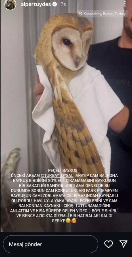 Tüydeş o görüntüleri, "Önceki akşam Turgay Uysal arayıp cam balkona baykuş girdiğini söyledi. Çıkamamasını baykuşun bir sakatlığı sanıyorlardı ama genelde bu durumda sorun cam korkulukları fark edemeyen baykuşun camı zorlamaya çalışmasından kaynaklı oluyordu. Havluyla yakalayabileceklerini ve cam balkondan kaynaklı çıkışı tutturamadığını anlattım ve kısa sürede gelen video. 'Böyle sihirli ve bence azıcık da gizemli bir hatıraları kaldı geriye' sözleriyle sosyal medya hesabından paylaştı. Görüntülerde havluyla yakalanan peçeli baykuşun, sakin bir şekilde etrafa baktığı görüldü. Baykuşun cam balkondan dışarı salındığı anlar da görüntüye yansıdı.