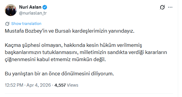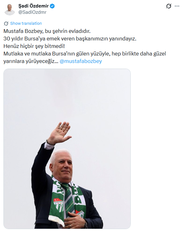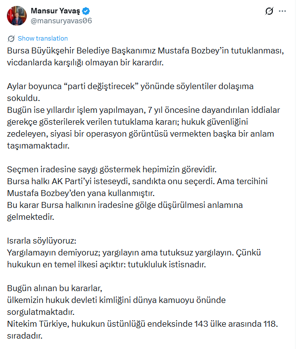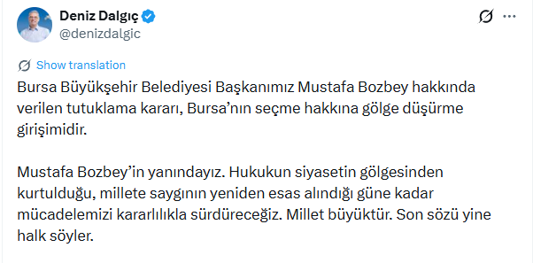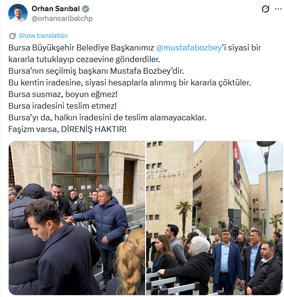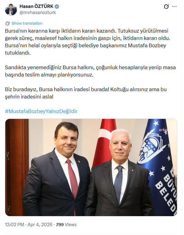 Bursa Büyükşehir Belediye Başkanı Mustafa Bozbey'in tutuklanmasına tepkiler peş peşe geldi.