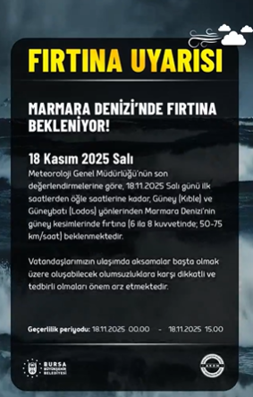 "Meteoroloji Genel Müdürlüğünün son değerlendirmelerine göre, 18.11.2025 Salı günü ilk saatlerden öğle saatlerine kadar, Güney (Kıble) ve Güneybatı (Lodos) yönlerinden Marmara Denizi’nin güney kesimlerinde fırtına (6 ila 8 kuvvetinde; 50–75 km/saat) beklenmektedir.