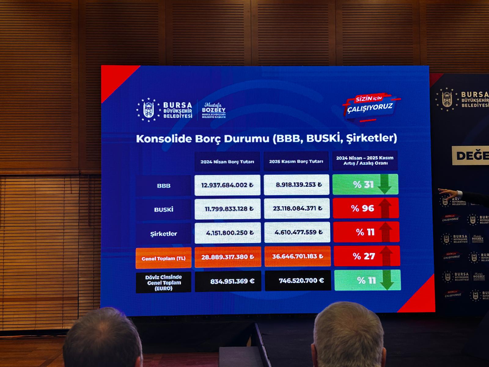 Bursa Büyükşehir Belediye Başkanı Mustafa Bozbey, Merinos AKKM Hüdavendigar Salonu’nda düzenlenen 2025 yıl sonu değerlendirme toplantısında Bursa’nın güncel borç durumunu açıkladı. Paylaşılan verilere göre, Bursa Büyükşehir Belediyesi, BUSKİ ve bağlı şirketlerin konsolide toplam borcu 36 milyar 646 milyon 701 bin 183 TL olarak kaydedildi.