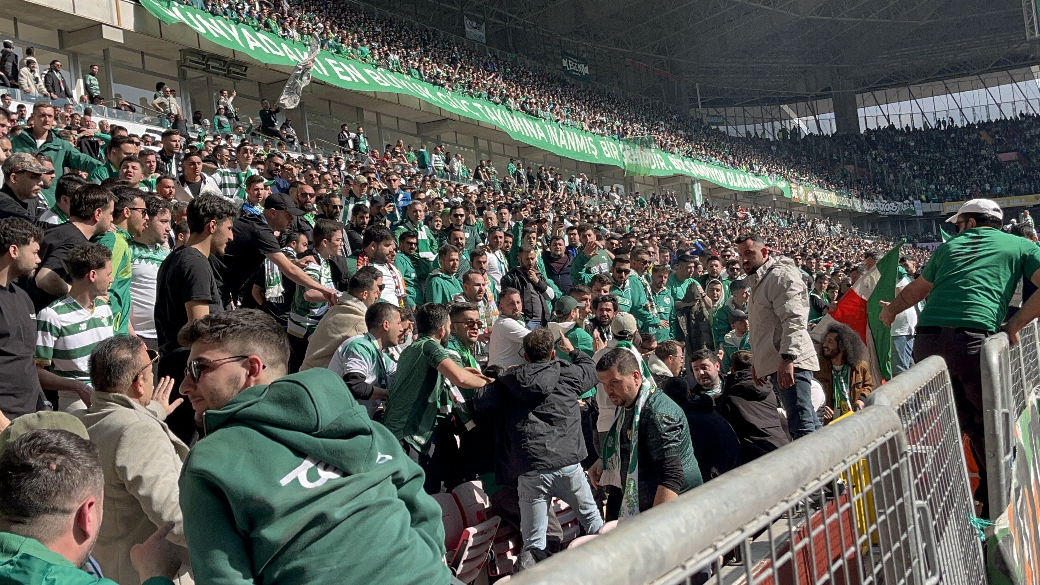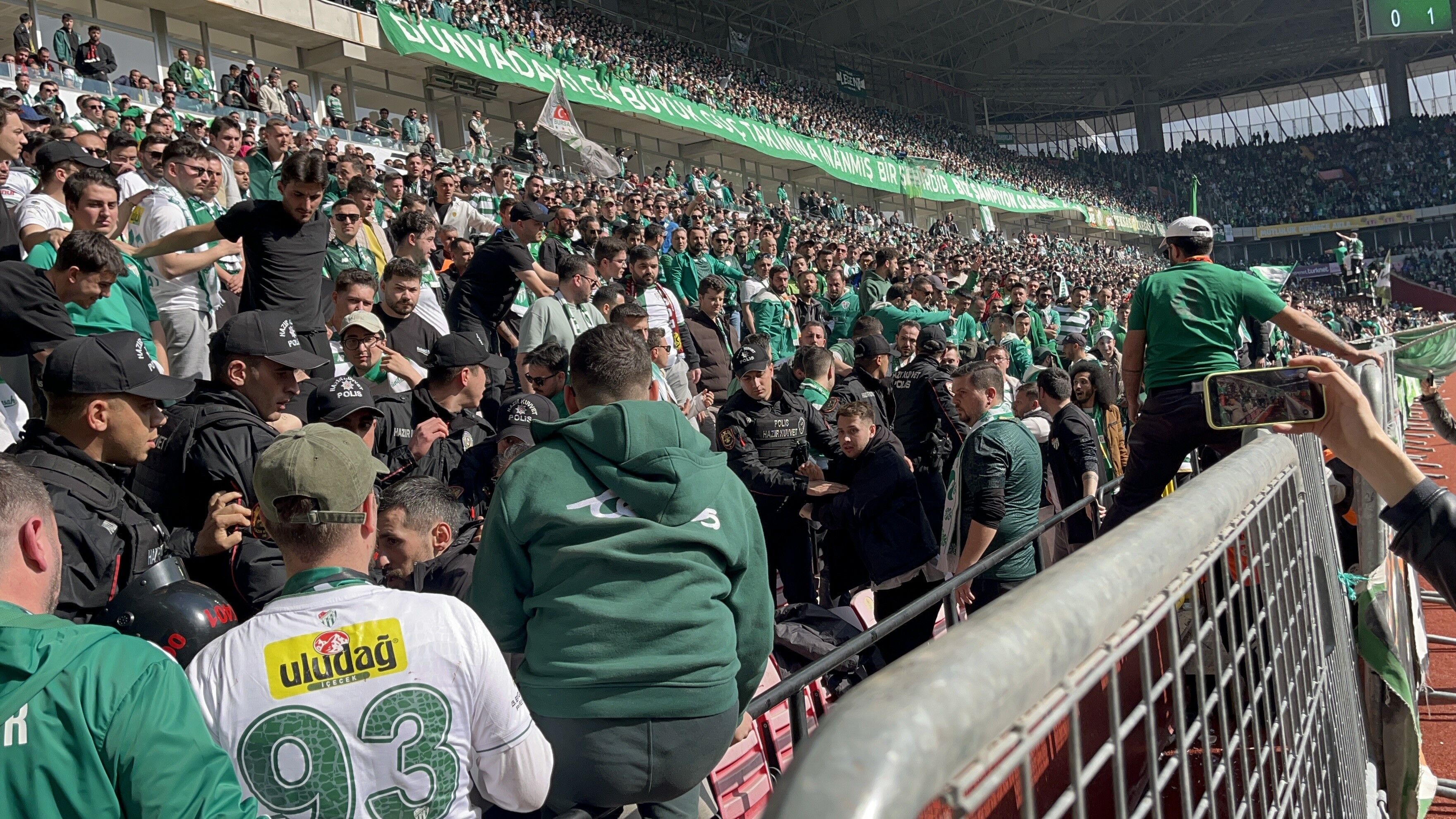 Maçın son dakikalarında Bursasporlu taraftarlar arasında henüz bilinmeyen bir sebeple çıkan tartışma kısa sürede kavgaya dönüştü. Yumruklarla birbirlerine saldıran taraflara, saha kenarında hazır bekleyen çevik kuvvet ekipleri müdahale etti.