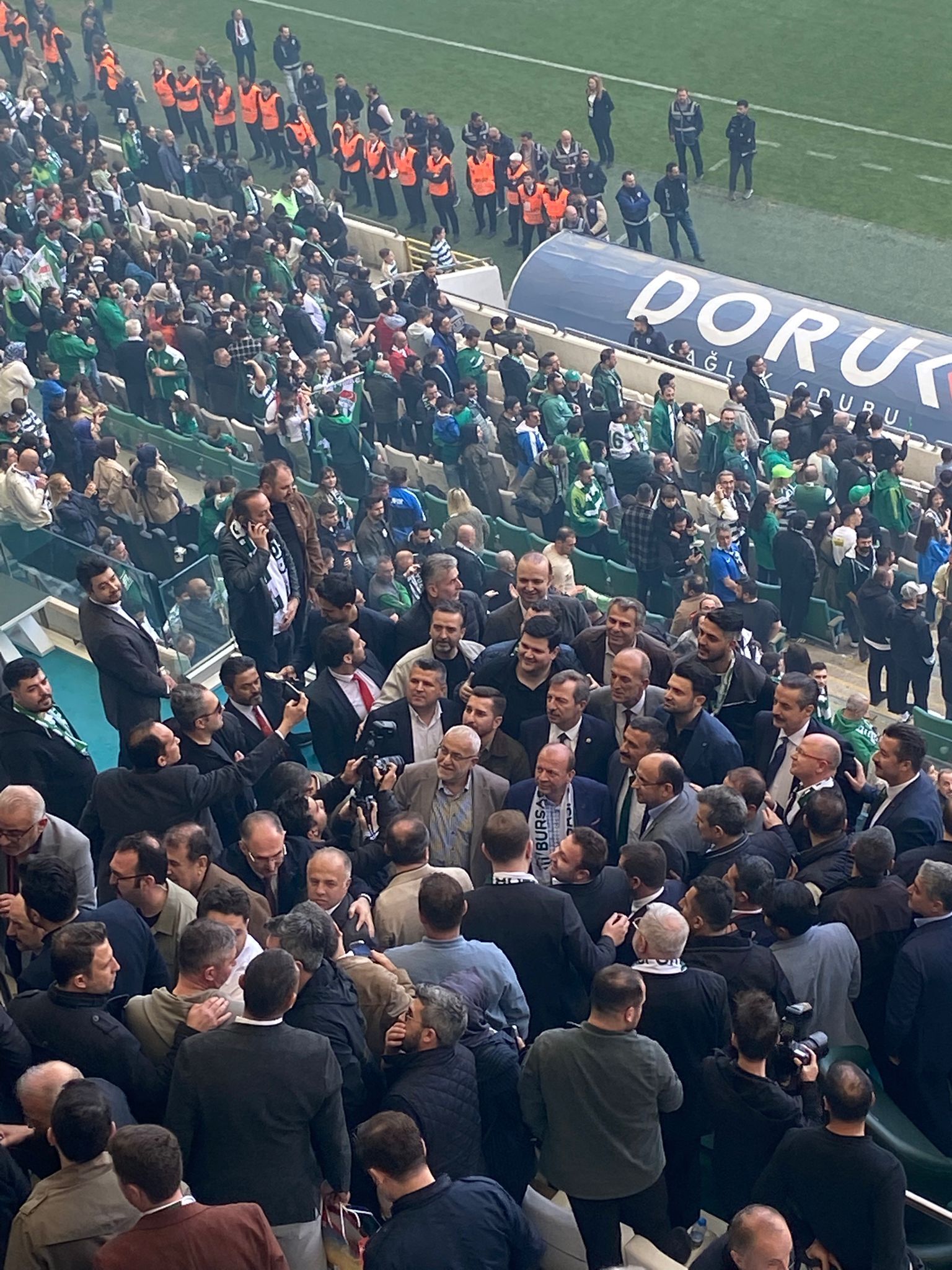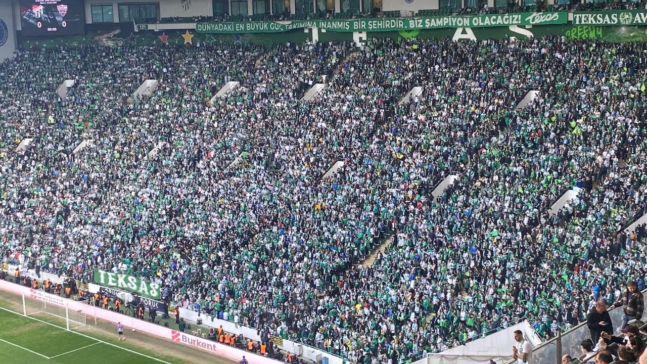 Dakikalar ilerledikçe taraftar desteği artıyor. Bursaspor taraftarı, takımlarını şampiyonluğa taşımak için 90 dakika boyunca susmadı.