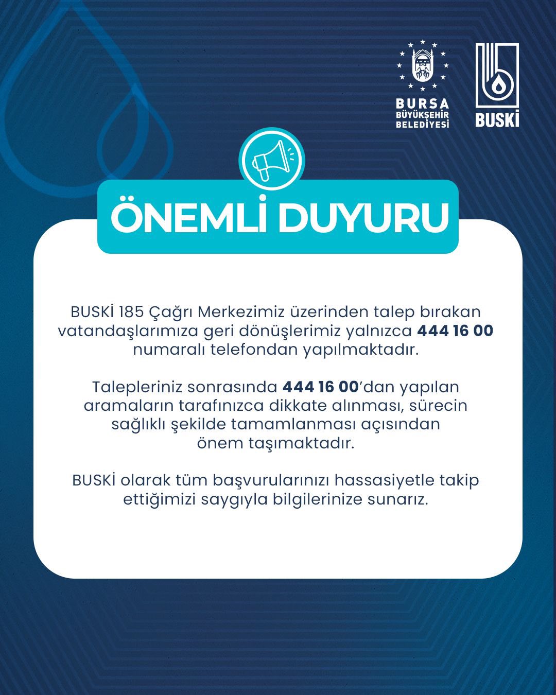 BUSKİ, tüm başvuruların hassasiyetle takip edildiğini belirterek, vatandaşların doğru bilgilendirilmesi adına resmi numaralar dışında yapılan aramalara itibar edilmemesi konusunda da dolaylı uyarıda bulundu.