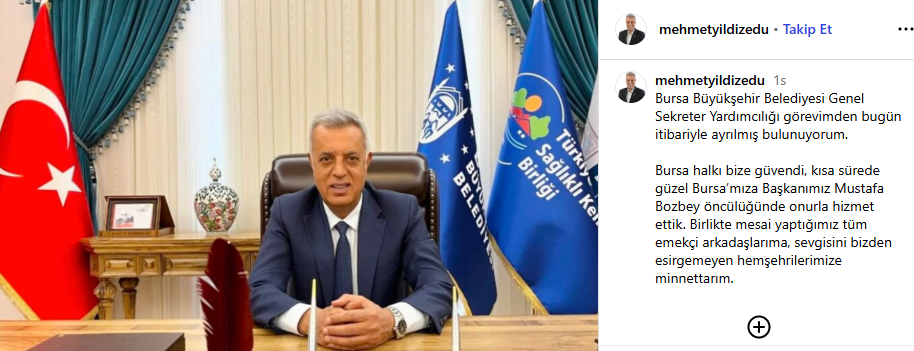 “Bursa Büyükşehir Belediyesi Genel Sekreter Yardımcılığı görevimden bugün itibariyle ayrılmış bulunuyorum. Bursa halkı bize güvendi, kısa sürede güzel Bursa’mıza Başkanımız Mustafa Bozbey öncülüğünde onurla hizmet ettik. Birlikte mesai yaptığımız tüm emekçi arkadaşlarıma, sevgisini bizden esirgemeyen hemşehrilerimize minnettarım.”