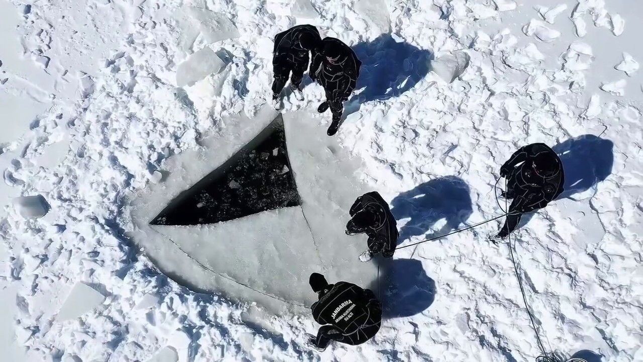 Ekipler buzla kaplı yüzeyi motorlu testere ile kesti ve nefes kesen bir dalış yaptı. Jandarma Genel Komutanlığı o anları sosyal medya hesabından paylaştı.