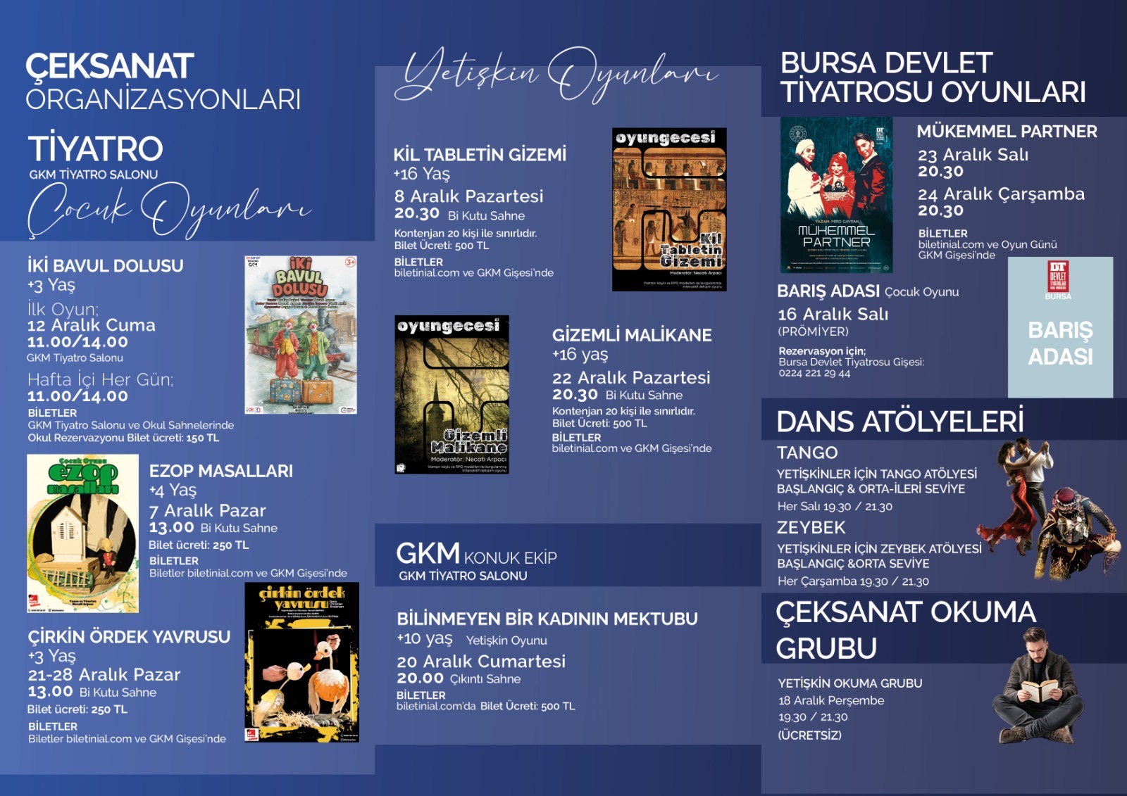 Ayrıca Bursa Devlet Tiyatrosu’nun çocuk oyunu “Barış Adası” 16 Aralık Salı günü GKM’de prömiyer yapacak.