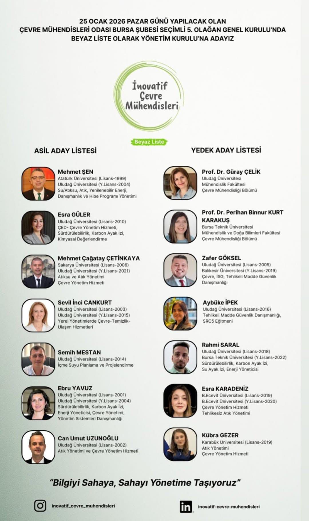 “Mesleki örgütümüzü daha da güçlendirmemiz gerekiyor. Daha fazla çevre mühendisini odamız çatısı altında buluşturmayı hedefliyoruz. Üye birlikteliğini, iş birliğini, şeffaflığı, inovatif ve proaktif yaklaşımı esas alacağız. Bursa’nın ve Balıkesir’in çevre sorunlarına ilişkin çözüm önerilerimizi kamu kurumlarına, sivil toplum kuruluşlarına ve ilgili yetkililere sunarak çözüm süreçlerine katkı sağlamayı planlıyoruz.”