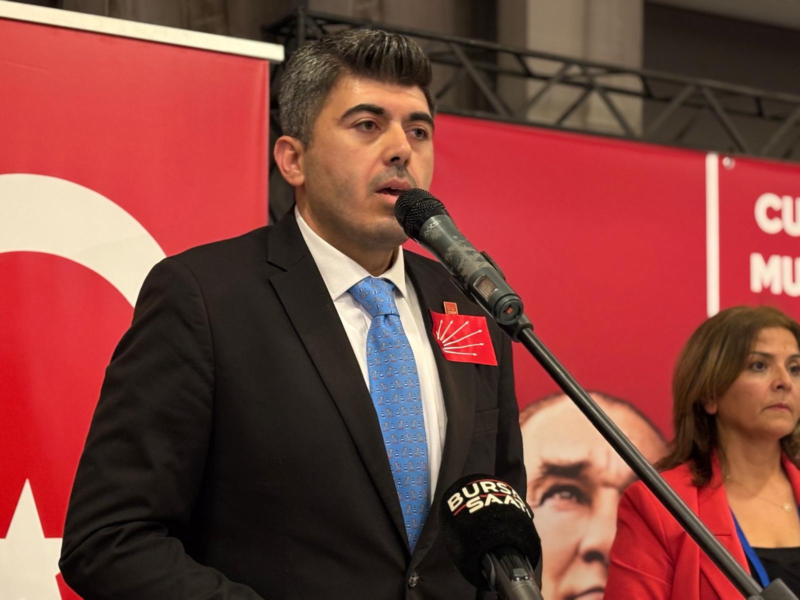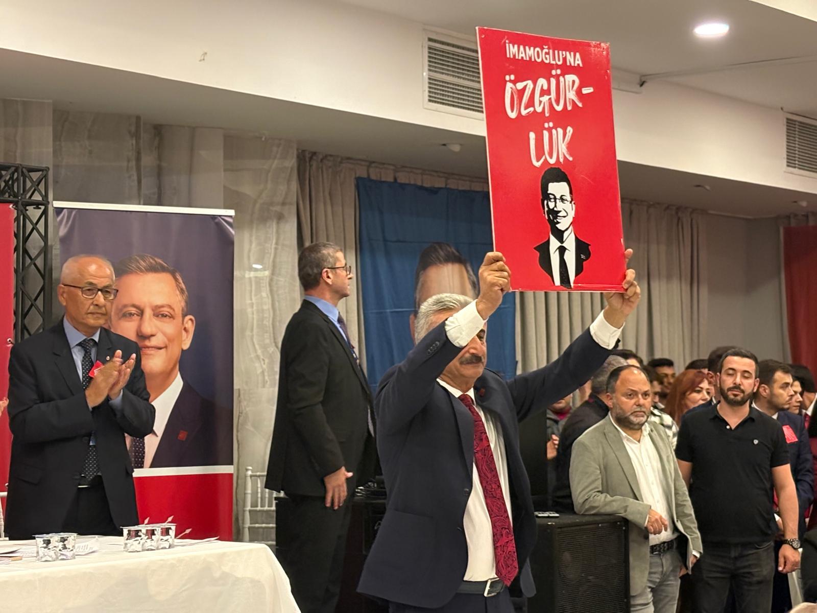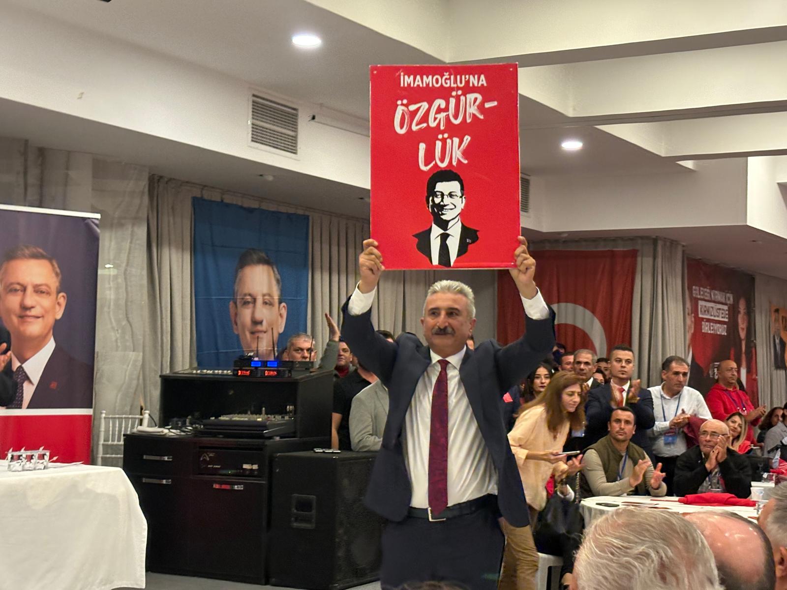 CHP Bursa İl Başkanı Nihat Yeşiltaş, konuşma öncesi kürsüye “İmamoğlu’na Özgürlük” sloganı ile çıktı.