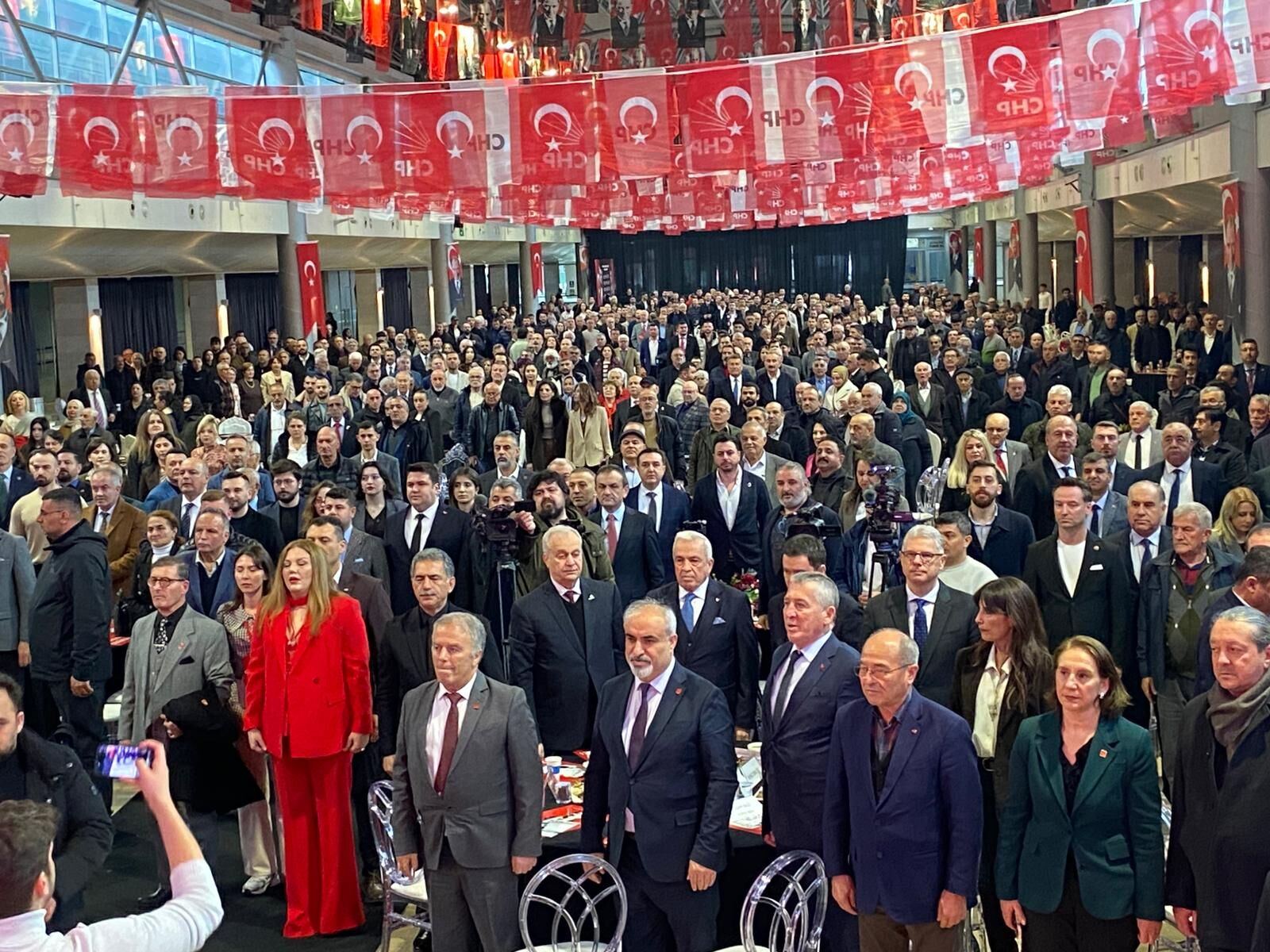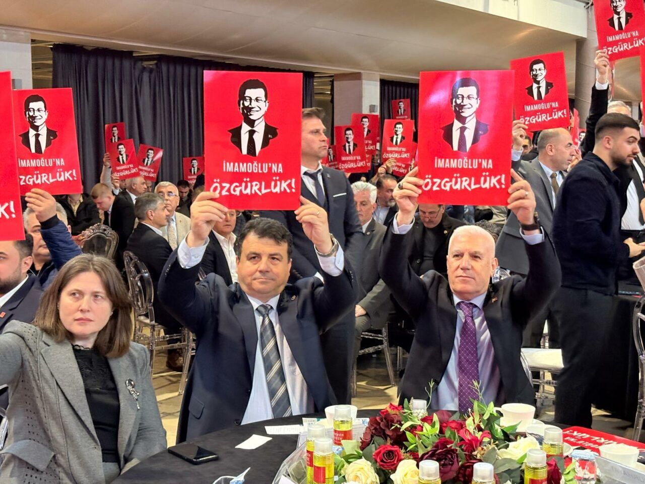 Yasaklanmak istenen Ekrem İmamoğlu’nun posteriyle İl Başkanı Nihat Yeşiltaş’ın sahneye çıkması, başta Mustafa Bozbey olmak üzere milletvekilleri (Orhan Sarıbal hariç) hepsinin aynı fotoğrafları kaldırması coşkuyu zirveye taşıdı.