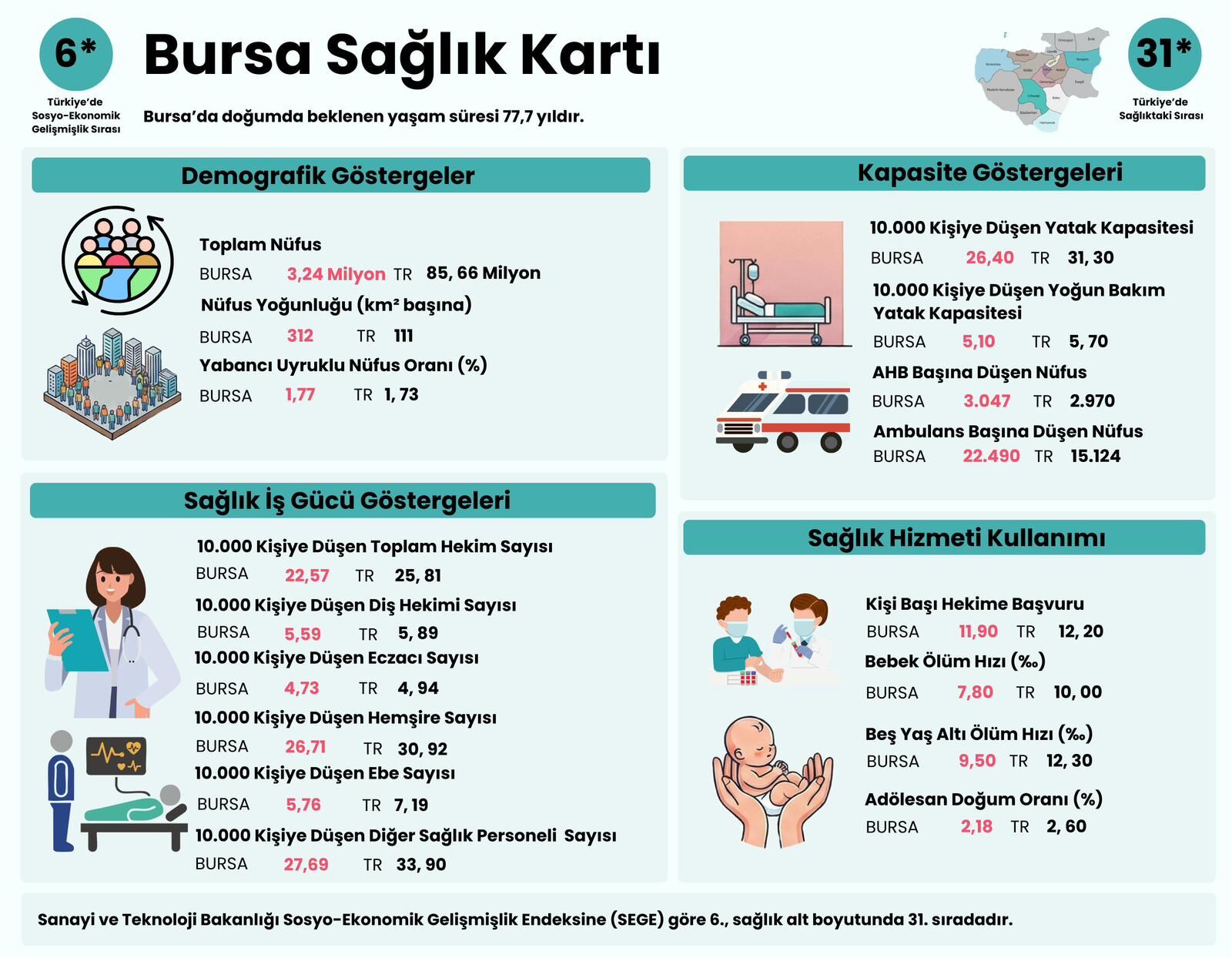 Sanayi ve üretim gücüyle Türkiye’nin lokomotif kentlerinden biri olan Bursa, sosyo-ekonomik gelişmişlik sıralamasında 6’ncı sırada yer alırken, sağlık alanında 31’inci sıraya kadar geriledi. Doğuşta beklenen yaşam süresi 77,7 yıl olarak ölçüldü.