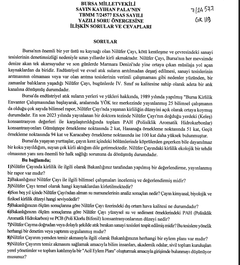 Ankara, 22.04.2026- Cumhuriyet Halk Partisi Sağlık Politika Kurulu Başkanı ve Bursa Milletvekili Prof. Dr. Kayıhan Pala, Nilüfer Çayında yıllardır süren kirliliğin son dönemde daha da yoğunlaştığını, bunun yalnızca çevresel bir tahribat değil, doğrudan halk sağlığını tehdit eden bir kriz haline geldiğini belirtti. Pala, “Nilüfer Çayı yalnızca Bursa’nın değil, tüm Marmara Havzası’nın en önemli can damarlarından biridir. Bir zamanlar zengin bir doğal hayatı besleyen bu kaynağı artık akarsu olarak nitelendirmek mümkün değildir. Nilüfer Çayı, kontrolsüz sanayi faaliyetleri ve çarpık kentleşme sonucunda maalesef tam anlamıyla bir atık su kanalına dönüştürülmüştür” dedi.
