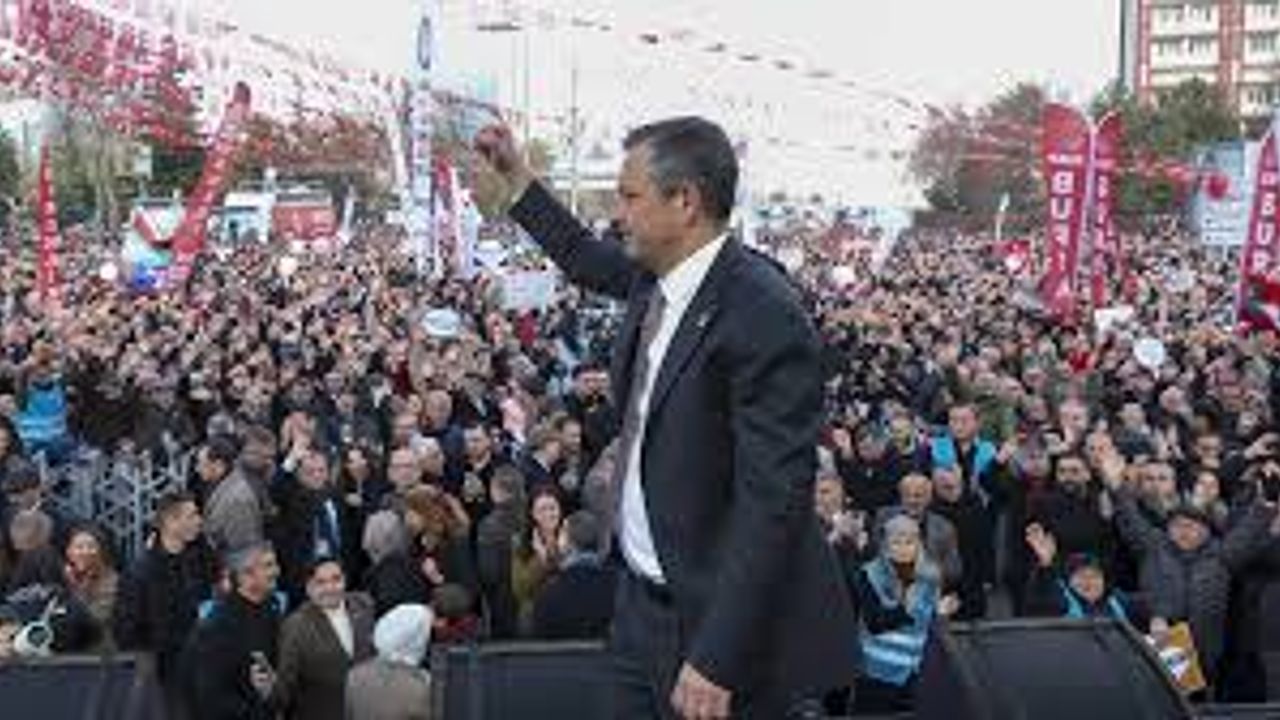 CHP Lideri Özgür Özel sağanak yağmura rağmen meydanı dolduran binlere sesleniyor.