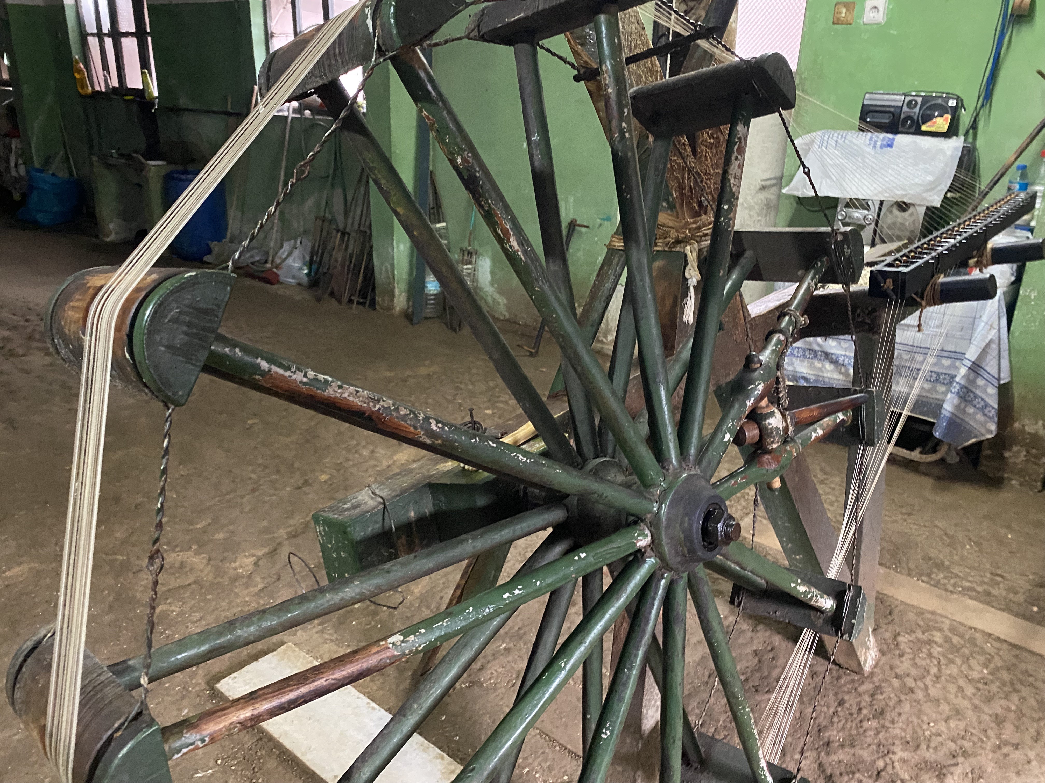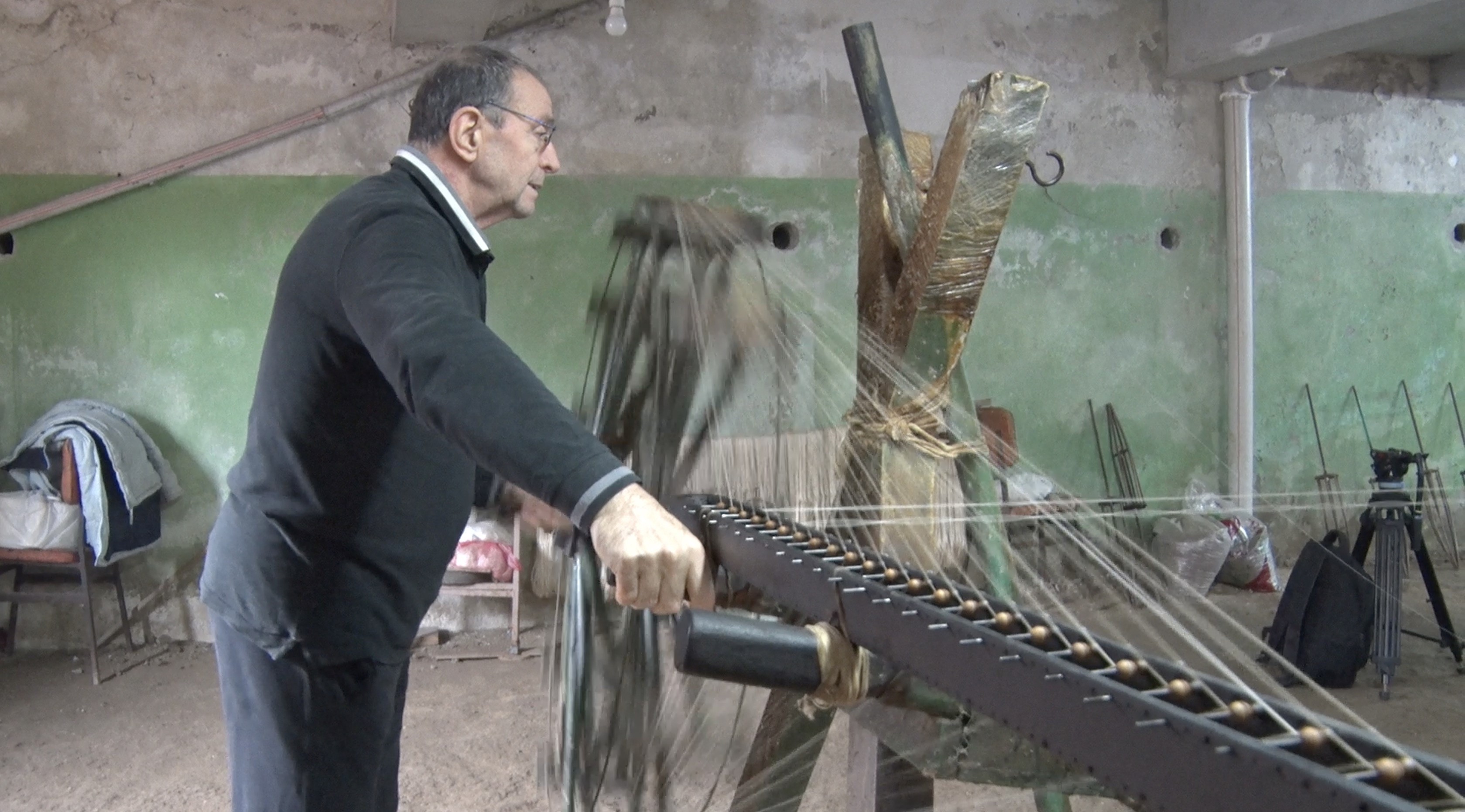 Bugün hâlâ aynı tezgâhın başında olan Şengünalp, üretim sırasında tezgâh üzerinde bulunan 24 kancaya bağlanan ipliklerle saatlerce koşarak çalışıyor. Yaklaşık 700 gram iplik elde edebilmek için günde en az 6 saat boyunca durmaksızın hareket ediyor.