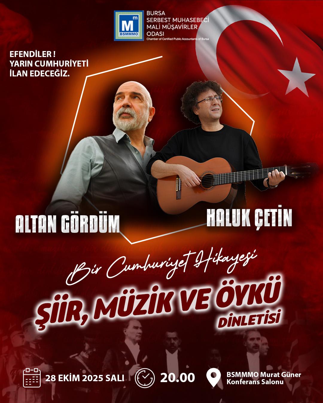 Bursa Serbest Muhasebeci Mali Müşavirler Odası (BSMMMO), Cumhuriyet’in 102. yılına özel anlamlı bir etkinliğe ev sahipliği yapacak. “Bir Cumhuriyet Hikayesi: Şiir, Müzik ve Öykü Dinletisi” adlı program, 28 Ekim 2025 Salı günü saat 20.00’de BSMMMO Murat Güner Konferans Salonu’nda gerçekleştirilecek.