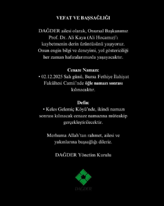 DAĞDER Yönetim Kurulu, yayımladığı mesajda Prof. Dr. Ali Kaya’ya Allah’tan rahmet, ailesi ve yakınlarına başsağlığı diledi.