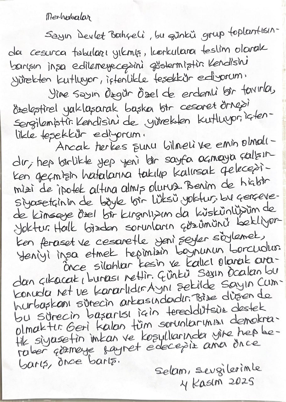 Demirtaş, "Yine sayın Özgür Özel de erdemli bir tavırla özeleştirel yaklaşarak başka bir cesaret örneği sergilemiştir. Kendisini de yürekten kutlıuyor, içtenlikle teşekkür ediyorum. Ancak herkes şunu bilmeli ve emin olmalıdır; hep birlikte yepyeni bir sayfa açmaya çalışırken geçmişin hatalarına takılıp kalırsak geleceğimizi de ipotek altına almış oluruz.Benim de hiçbir siyasetçinin de bmyle bir lüksü yoktur, bu çerçevede kimseye özel bir kırgınlığım ya da küskünlüğüm de yoktur." dedi.