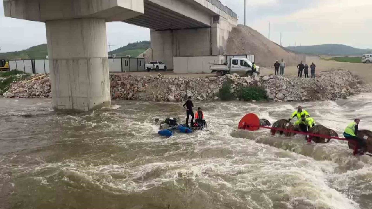 Bursa'nın Yenişehir ilçesinde Kocasu Deresi'nden traktörle karşıya geçmek isteyen 10 işçinin bulunduğu traktör, suyun ortasında devrildi. Akıntının etkisiyle dengesini kaybeden traktördeki işçiler dere içinde mahsur kaldı.