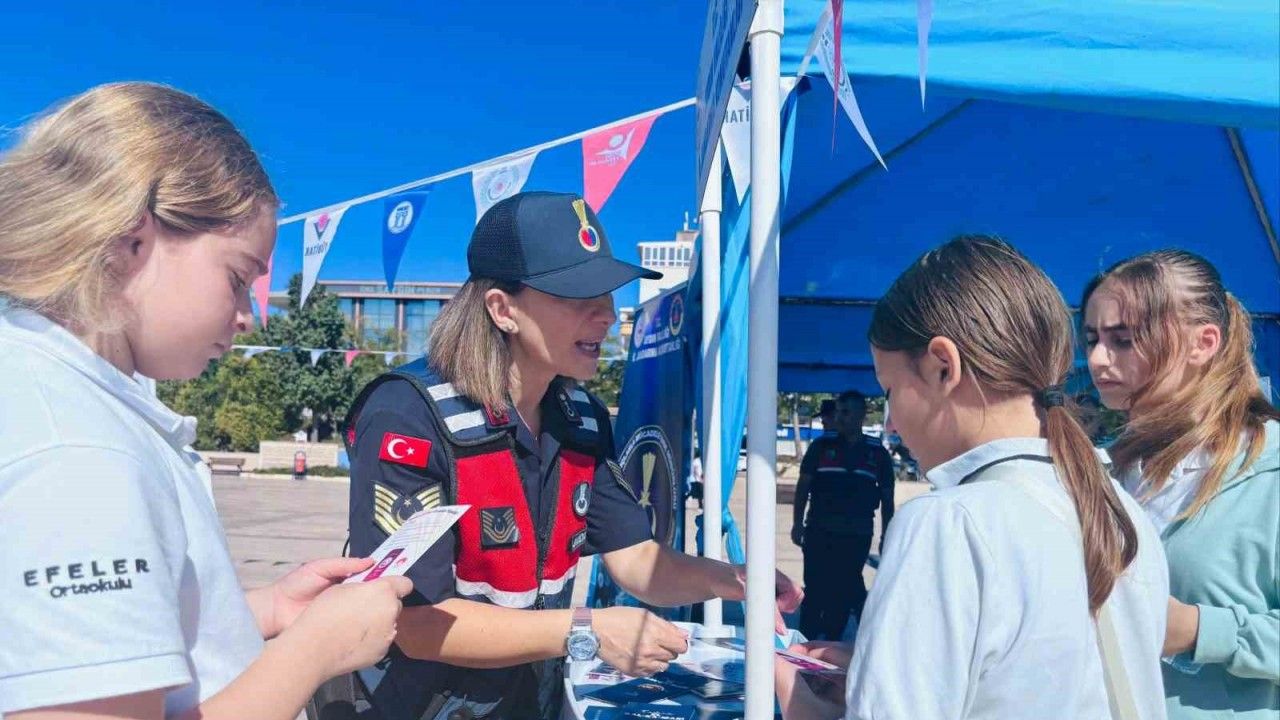 Aydın İl Jandarma Komutanlığı Aile içi Şiddetle Mücadele ve Çocuk Kısım Amirliği ve Didim ilçe Jandarma Komutanlığı personeli tarafından Didim’de düzenlenen Bilim ve Teknoloji şenliğinde stant açılarak KADES Uygulaması, Erken Yaşta ve Zorla Evliliklerin Önlenmesi, Kadına Yönelik Şiddetle Mücadele konularında bilgilendirme yapılırken, broşür ve tanıtıcı materyaller dağıtıldı. Standı ziyarete gelen katılımcılara KADES uygulamasının indirilmesi, kullanımı ve acil durumlarda sağladığı avantajlar uygulamalı olarak anlatıldı. Erken yaşta evliliklerin çocukların eğitim, sağlık ve psikolojik gelişimi üzerindeki olumsuz etkilerine dikkat çekildi. Jandarma Teşkilatı olarak her zaman vatandaşların yanında olduğu vurgulandı.