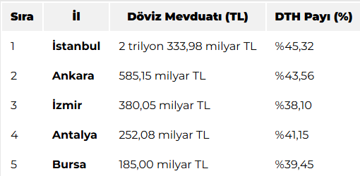 Döviz kurlarındaki durgun görünüme karşılık DTH’larda artış devam ederken; BDDK tarafından açıklanan verilere göre 2025 sonu itibarıyla döviz mevduatı (TL karşılığı olarak) tutar bazında en yüksek ilk 5 il şöyle: