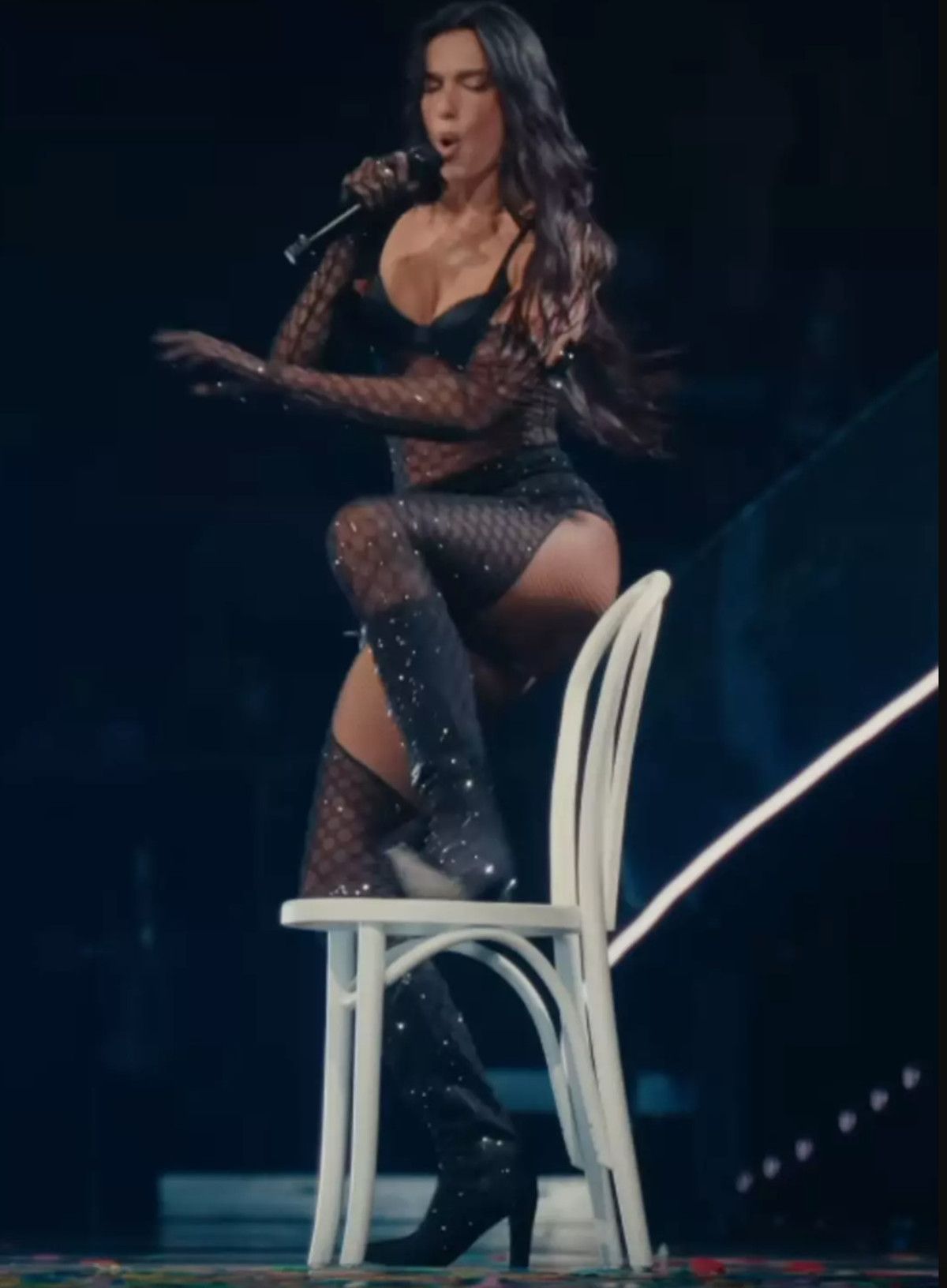 İlk sahneye çıkışında file çoraplar, askılı aksesuarlar ve siyah topuklu çizmelerle dikkat çeken Dua, fit vücudunu öne çıkaran siyah büstiyer ve mini şort kombinini file eldivenlerle tamamladı.