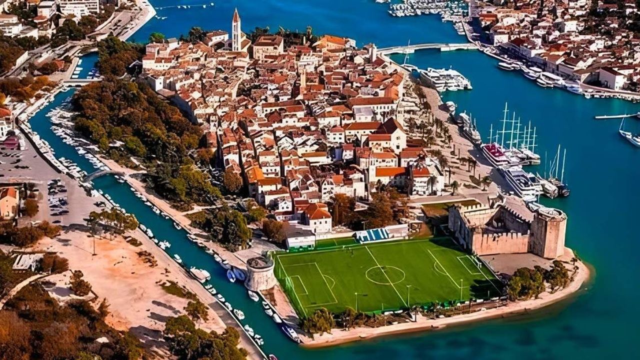 Sahanın resmi kapasiesi bin kişi. Ama asıl seyirci, sahanın etrafından geçen turistler. İki kişinin yan yana zar zor yürüdüğü dar taş sokakların bittiği yerde, tel örgünün arkasında top koşturan futbolcuları görmek, Trogir'in en şaşırtıcı manzaralarından biri.