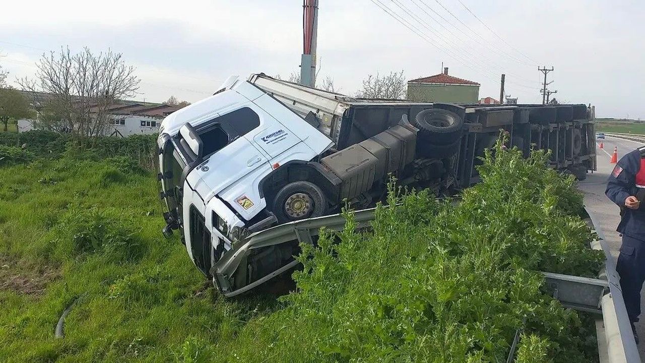Edirne-Keşan karayolunda sürücüsünün direksiyon hakimiyetini kaybettiği tır yoldan çıkarak devrildi.