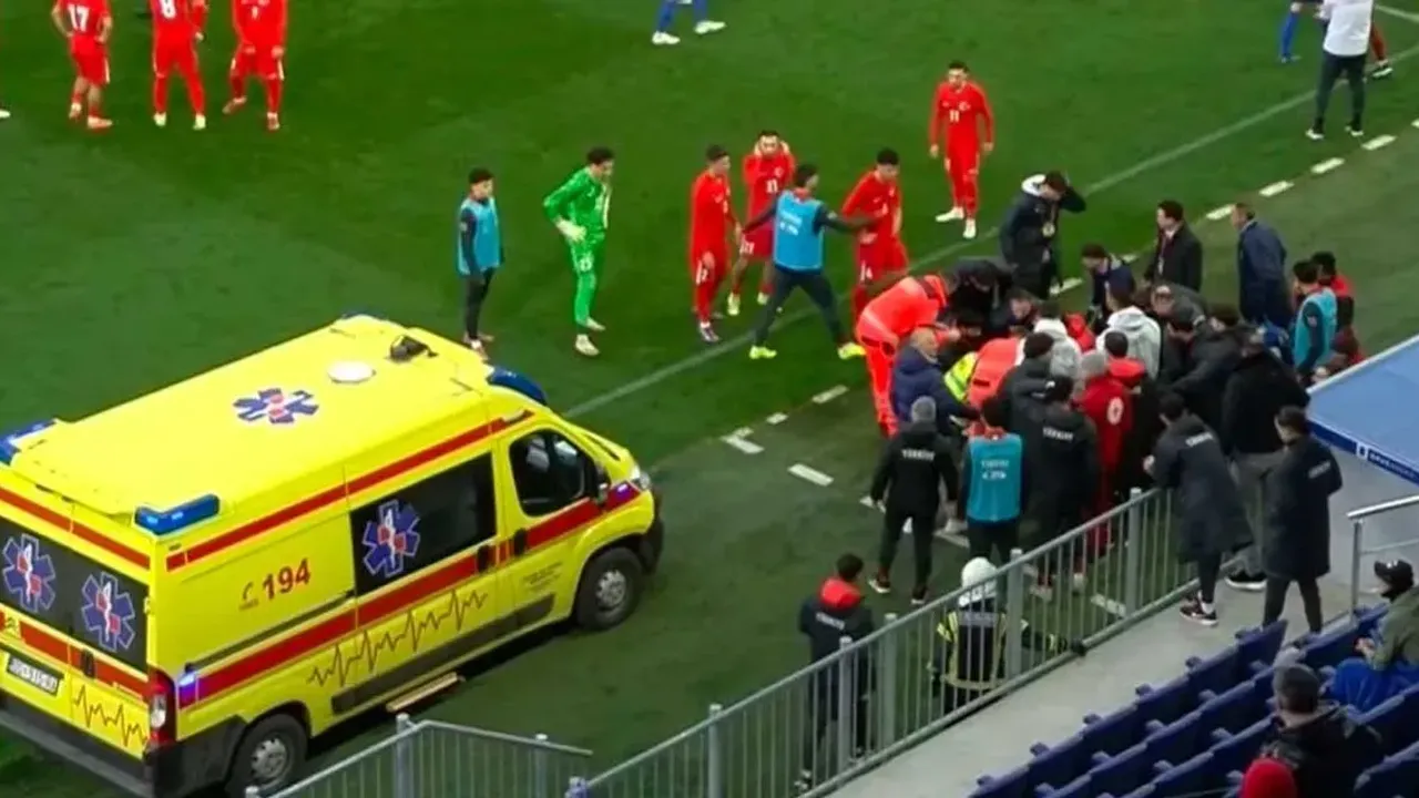 Müsabakanın devam ettiği esnada Türkiye U21 Teknik Direktörü Egemen Korkmaz, fenalaşarak yere yığıldı.