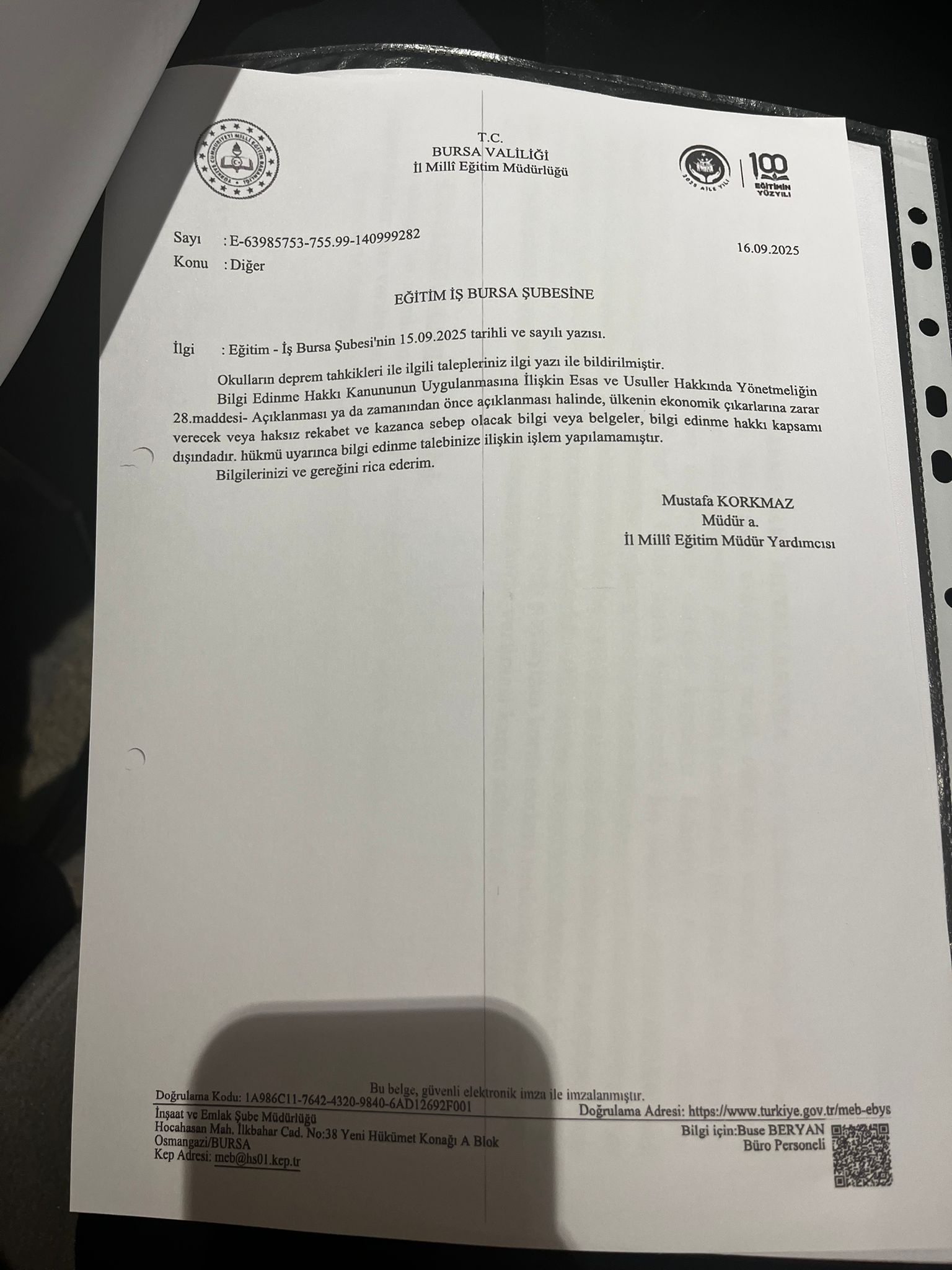15 Eylül 2025’te Milli Eğitim Müdürlüğü’ne yaptıkları bilgi edinme başvurusunun reddedildiğini hatırlatan Rona, bu durumun “çocukların ve öğretmenlerin güvenliği konusunda ciddi soru işaretleri yarattığını” dile getirdi.