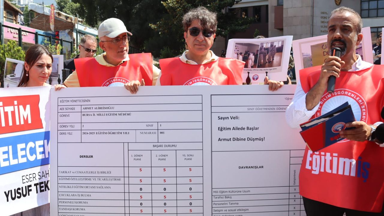 Eğitim İş Bursa Şubesi, 2024-2025 eğitim ve öğretim yılını değerlendirmek ve "Bursa İl Milli Eğitim Müdürüne karne veriyoruz" konulu basın açıklaması düzenlemek için Bursa İl MEM önünde toplandı.