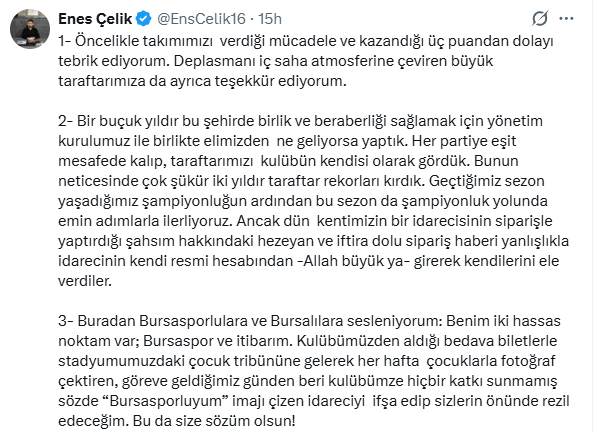 Bursaspor Başkanı Enes Çelik'in paylaşımı