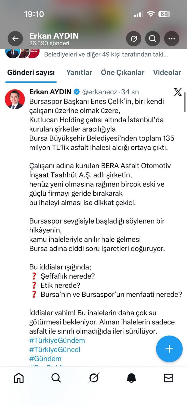 Osmangazi Belediye Başkanı Erkan Aydın’ın resmi X (Twitter) hesabından yapılan ve kısa süre sonra silinen bir paylaşım Bursa kamuoyunda geniş yankı uyandırdı. Paylaşımda, Bursaspor Başkanı Enes Çelik’in Kutlucan Holding çatısı altındaki şirketler aracılığıyla Bursa Büyükşehir Belediyesi’nden toplam 135 milyon TL’lik asfalt ihalesi aldığı iddia edildi.