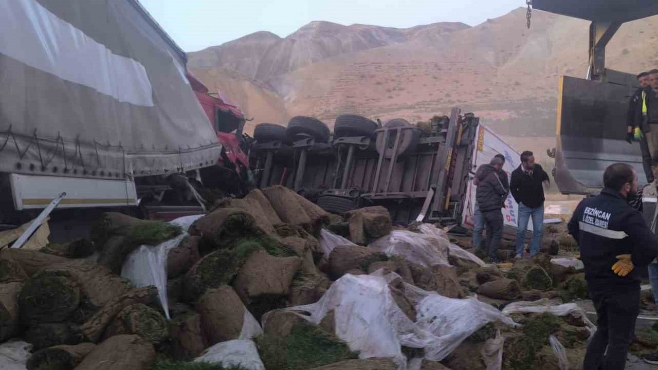 Kaza, Erzincan-Sivas kara yolu Kırkgöz Deresi mevkiinde meydana geldi. Alınan bilgiye göre, kontrolden çıkan çim yüklü tır ile seyir halindeki diğer bir tır çarpışarak yoldan çıktı. Kazada tır sürücüleri yaralandı.