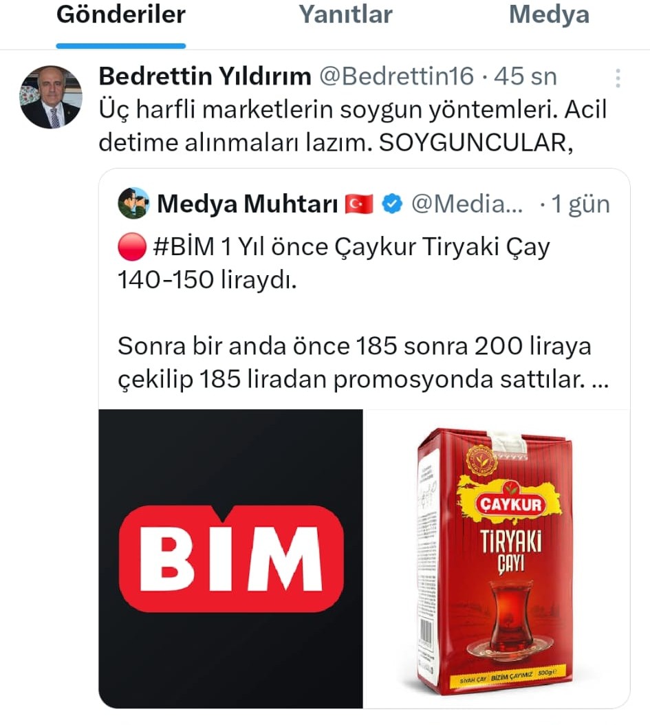 Yıldırım’ın bu sözleri, “Medya Muhtarı” adlı hesabın BİM marketlerinde satılan Çaykur Tiryaki Çayı örneğiyle yaptığı paylaşımı alıntılayarak dile getirdiği görüldü. Söz konusu paylaşımda, bir yıl önce 140–150 TL civarında satılan çayın fiyatının 200 liraya çıkarıldığı, ardından “185 liradan promosyon” olarak satışa sunulduğu iddia edilmişti.