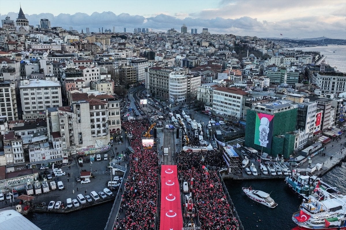 Galata Köprüsü'nden dünyaya Gazze mesajı göndermek için toplanan yüz binler, "Sinmiyoruz, susmuyoruz, Filistin'i unutmuyoruz" sözleriyle haykırdı.