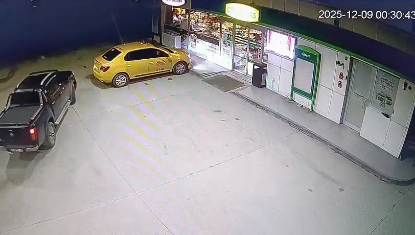 Gece saat 02.00 sıralarında yaşanan ve yarım saatlik kovalamacayla sona eren taksi gasbının, benzin istasyonundaki başlangıç anları güvenlik kamerasına yansıdı.