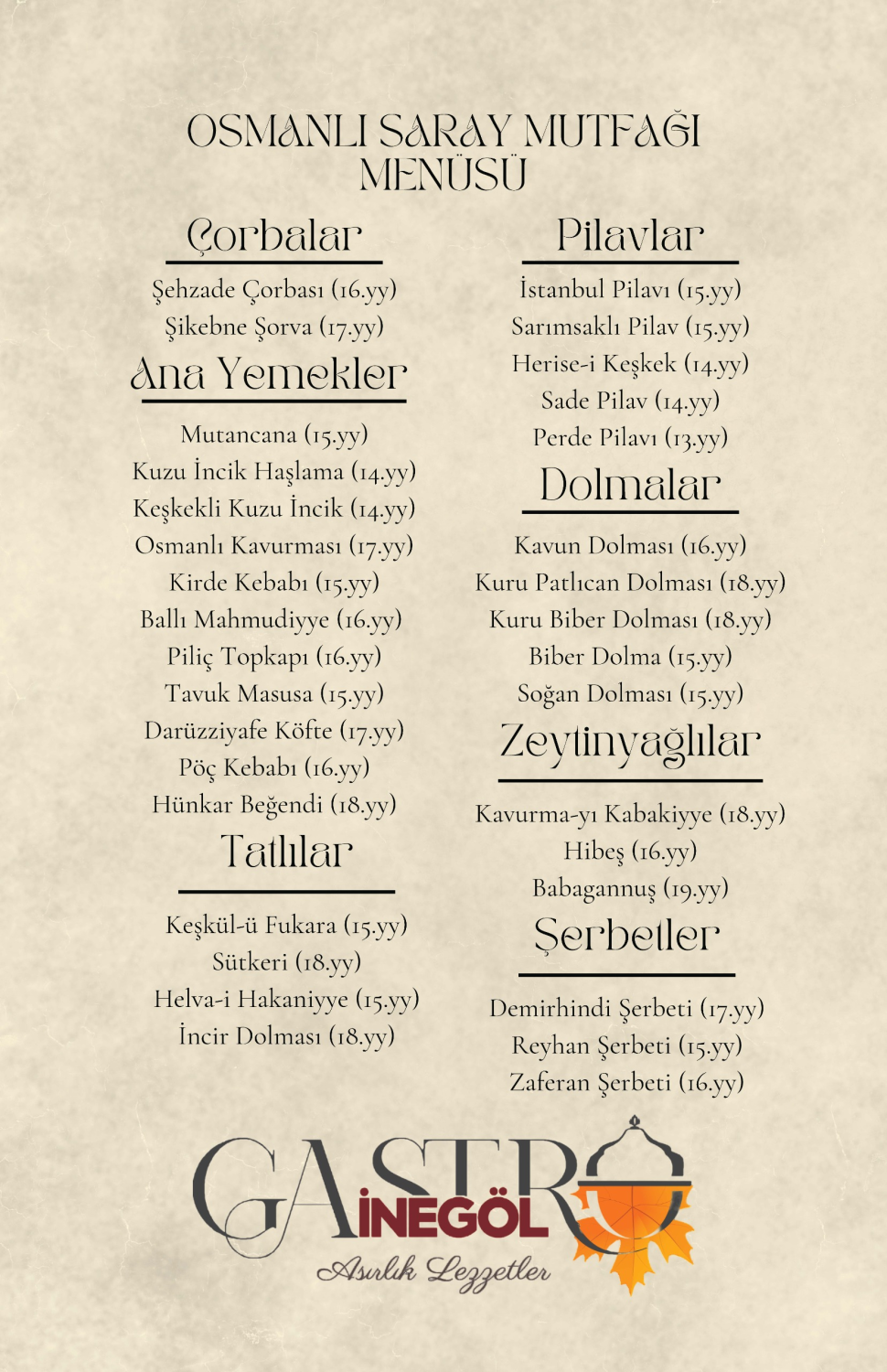 Gastro İnegöl’ün Osmanlı Saray Mutfağı Menüsünde çorbasından ana yemeklerine, pilavlardan dolmalara, zeytinyağlılardan tatlılar ve şerbetlere kadar her şey Osmanlı Saray Mutfağının eşsiz lezzetlerinden oluştu. Tarihleri 13. yüzyıldan başlayarak 18. yüzyıla kadar uzanan 700 yıllık lezzetlerin menüyü süslediği bu özel günde, saraylardan sofraya uzanan yolculuğa vatandaşların da ilgisi yoğun oldu. Gastro İnegöl’ün Osmanlı Mutfağı Menüsünü deneyimlemek için gelen vatandaşlar, şeflerin tanıtım ve sunumlarıyla onlarca çeşit arasından yemek istedikleri lezzetleri belirlediler.