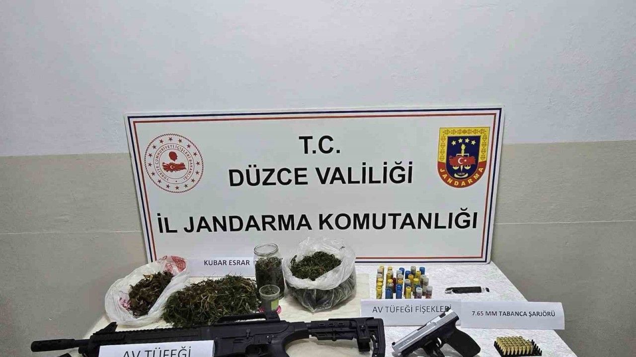 Düzce Cumhuriyet Başsavcılığı koordinesinde jandarma ekiplerince yapılan çalışmalarda Gölyaka ilçesinde M.Ş isimli şahsın evinde ve bahçesinde uyuşturucu madde bulundurduğuna yönelik duyum alındı. Alınan istihbarı bilgiler kapsamda; Cumhuriyet Başsavcılığından alınan arama kararı sonrası şahsın evi, eklentilerinde yapılan arama sonucunda 500 gram kubar esrar, 1 adet tabanca, 2 adet şarjör, 38 adet 9 mm çapında tabanca fişeği, 1 adet 7.65 mm çapında tabanca şarjörü, 1 adet yivsiz av tüfeği, 3 adet yivsiz av tüfeği şarjörü, 38 adet av tüfeği kartuşu ele geçirildi. Şahıs gözaltına alınırken, hakkında adli işlem başlatıldığı öğrenildi.