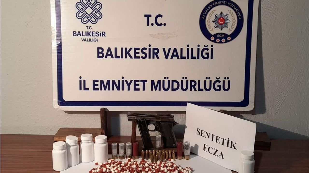 Gönen İlçe Emniyet Müdürlüğü ekiplerince yapılan çalışmalar çerçevesinde G.Ö. isimli şahsa ait ikamette arama gerçekleştirildi. Edinilen bilgiye göre, gecikmesinde sakınca bulunan hâl kapsamında yapılan aramada; 1 adet Browning ibareli tabanca, 919 mm çapında dolu tabanca fişeği, 7 adet dolu av fişeği kartuşu ile 5 kutu içerisinde toplam 240 adet sentetik ecza maddesi ele geçirildi.