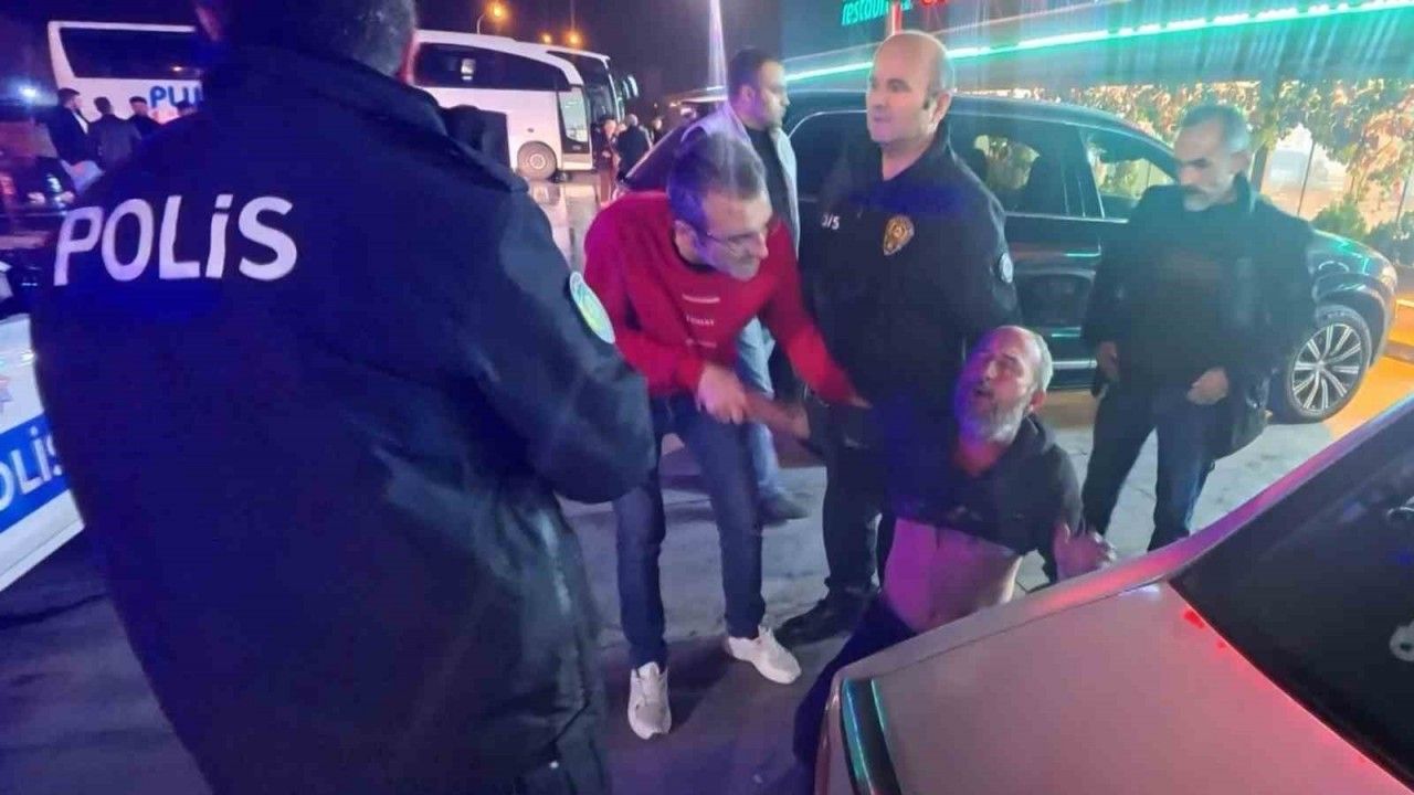 Olay, Aksaray-Adana karayolu Karasu Kavşağı’nda bulunan bir tesiste yaşandı. Edinilen bilgiye göre, aldıkları alkolün etkisiyle elindeki bıçakla tesiste sıkıntı çıkaran şahıslar, vatandaşlar ve tesis yetkilisi tarafından polise bildirildi. İhbar üzerine olay yerine polis ekipleri sevk edildi. Kısa sürede adrese gelen ekipler şahısların üzerini aramak isteyince şahıslar memurlara güçlük çıkardı. Bir süre sonra polis ekiplerine mukavemette bulunan şahıslardan biri biber gazı sıkılarak etkisiz hale getirildi. Ardından polis aracına bindirilmek istenen alkollü şahıs bu kez de biber gazının etkisiyle açamadığı gözlerini bahane ederek gözaltına alınmak istemedi. "Benim gözümü açın görmüyorum ben. Neredeyim ben?" dedi. Polis merkezine gitmeyi istemeyen şahıs ve basın mensuplarına görüntü engel olmak isteyen arkadaşı, polis tarafından kelepte takılarak gözaltına alınırken, bindirildikleri polis aracıyla polis merkezine götürüldü. Olayla ilgili başlatılan inceleme sürüyor.