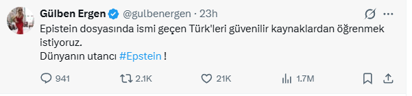 Şarkıcı sosyal medya hesabından paylaşım yaparak "İsmi geçen Türkleri güvenilir kaynaklardan öğrenmek istiyoruz." dedi.