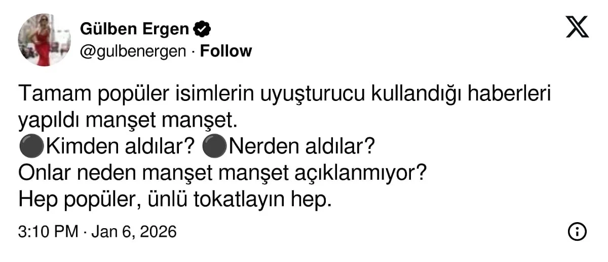 "Hep ünlüleri tokatlayın" ifadesini kullanan Ergen, asıl üzerinde durulması gereken konunun bu maddelerin kimler tarafından ve hangi yollarla temin edildiği olduğunu vurguladı.