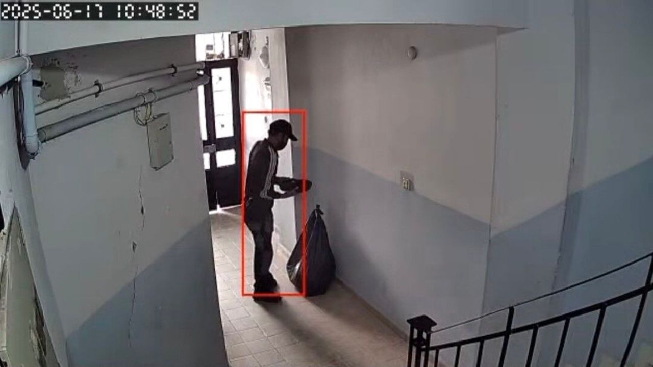 O anlar, apartmanın güvenlik kamerasına saniye saniye yansıdı. Görüntülerde, hırsızın sırtında taşıdığı koca poşeti bina girişine bırakarak üst katlarda dolaştığı ve çaldığı ayakkabıları poşetine doldurduktan sonra binadan ayrıldığı görülüyor.