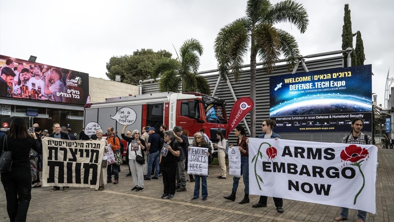 Güvenlik nedeniyle isim açıklamayan grup, "silah endüstrisinin Gazze'deki işgal ve soykırımdan elde ettiği kârları protesto ettiklerini ve bu silahları satan şirketleri ve uluslararası müşterileri kınamak için toplandıklarını" açıkladı.
