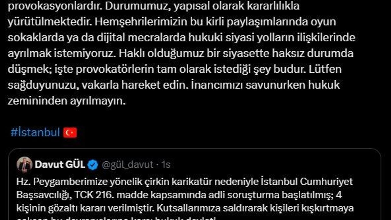 İstanbul Valisi Davut Gül, bir mizah dergisinde Peygamber Efendimize yönelik karikatür yayımlanmasıyla ilgili, "Kutsallarımıza saldırarak toplumu provoke etmeye çalışan bu zihniyete karşı hukuk devleti gereğini yapmaktadır. Milletimizin inancına uzanan hiçbir alçaklığa sessiz kalmayacağız" dedi.