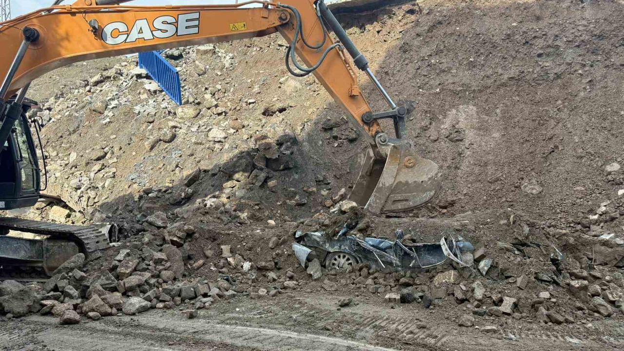 Hatay'da çöken istinat duvarının altında kalarak hurdaya dönen araçlar ekiplerin çalışmalarıyla kurtarıldı.