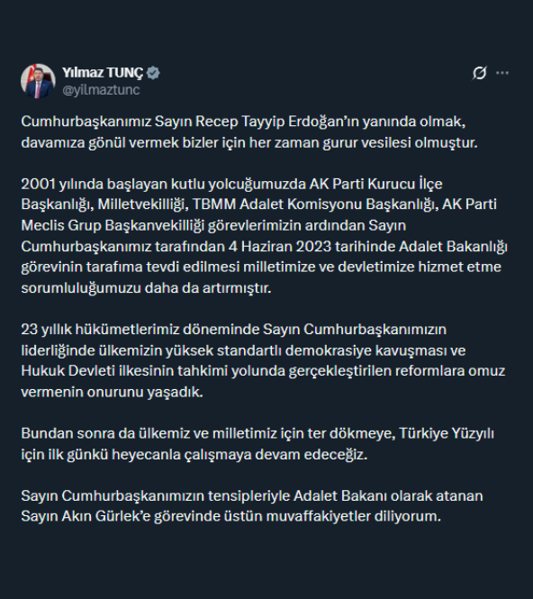 Yılmaz Tunç da yaptığı paylaşımla Adalet Bakanı olarak atanan Akın Gürlek'e başarı dileklerini iletti.