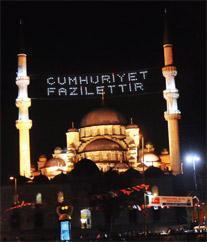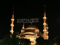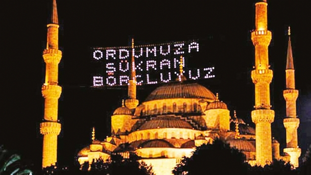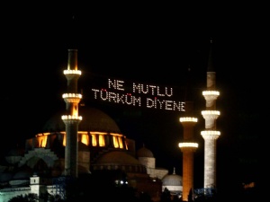 · “Ne Mutlu Türküm Diyene” yazan mahyalar – milli birlik ve kimlik vurgusu yapıyor.