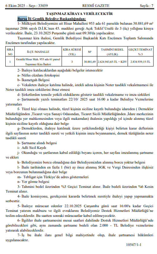 Bursa’nın Gemlik ilçesinde, Gemlik Belediyesi mülkiyetinde bulunan Hisar Mahallesi 953 ada 61 parseldeki 30.881,69 metrekarelik taşınmaz, üç yıl süreyle kiraya verilecek.
