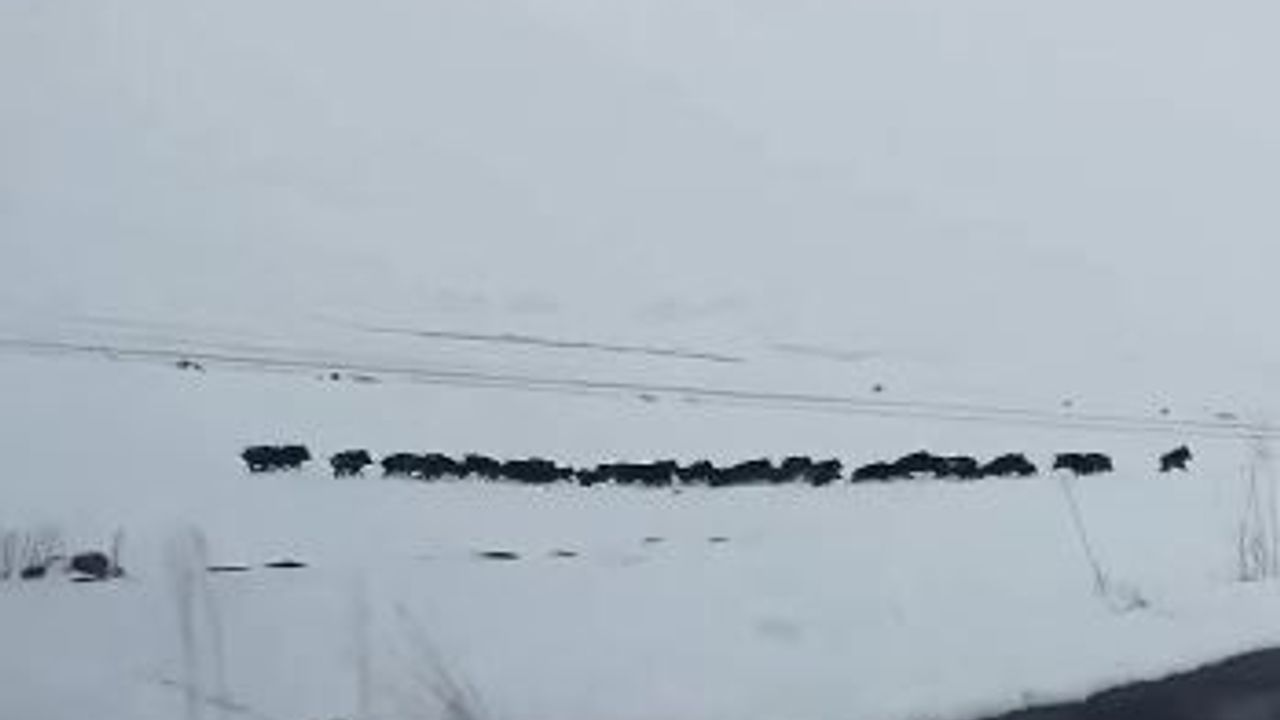 Ardahan'da sürü halinde karla kaplı araziden ilerleyen domuz sürüsü görüntülendi.